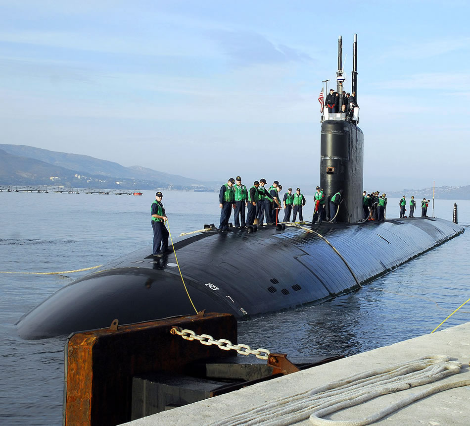 SOUDA BAY, Crete (Nov. 24, 2007) U.S. Naval Support Activity employees assist with mooring operations as the Los Angeles-class nuclear-powered submarine USS Montpelier (SSN 765) arrives pierside in Souda Harbor for a routine port visit. Montpelier departed her homeport of Norfolk, Va., earlier this month for a scheduled six-month deployment as part of the HARRY S. TRUMAN Strike Group. The submarine will operate in the Central Command area of responsibility both independently and in coordination with the strike group. U.S. Navy photo by Mr. Paul Farley