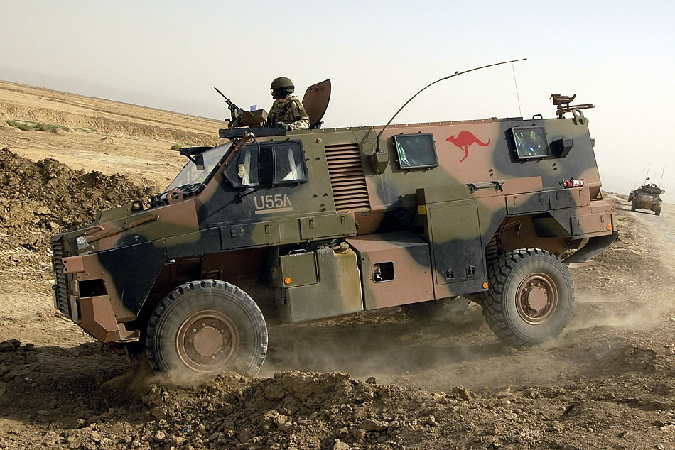 Related ArticleAn Australian designed and made Bushmaster infantry mobility vehicle from the Al Muthanna Task Group moves off a dirt track to rendezvous with soldiers from the Australian Army Training Team - Iraq in the wastelands south of Al Khidr in the Al Muthanna province. The Bushmaster has proven to be very popular with the Australian soldiers due to its armour protection, powerful CAT engine, air conditioning and interior space.