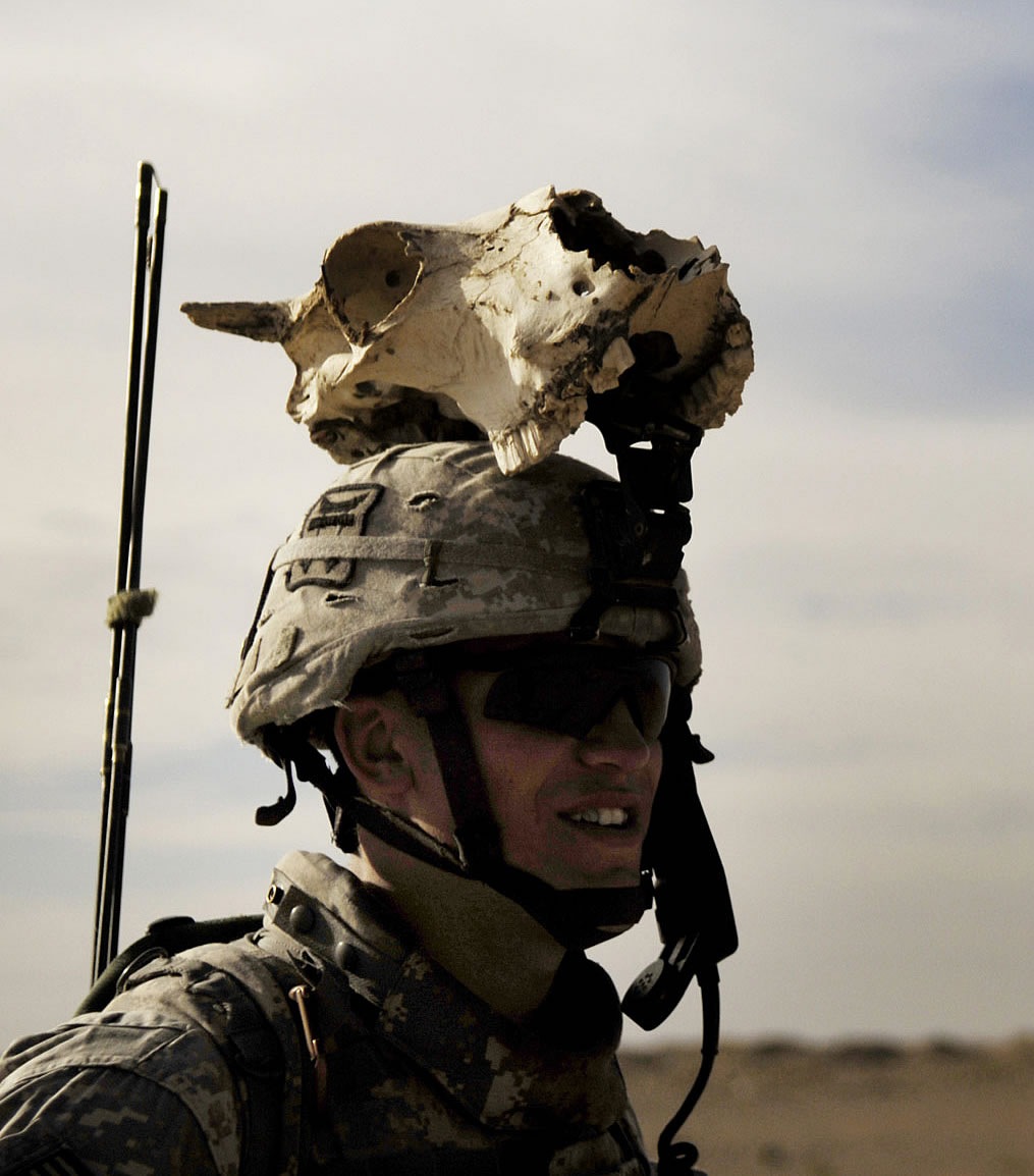 A U.S. Army Soldier from 3rd Battalion, 187th Infantry Regiment, 3rd Brigade Combat Team, 101st Airborne Division has fun with a cow skull in Owesat, Iraq, Dec. 18, 2007. U.S. Air Force photo by Tech. Sgt. Adrian Cadiz.