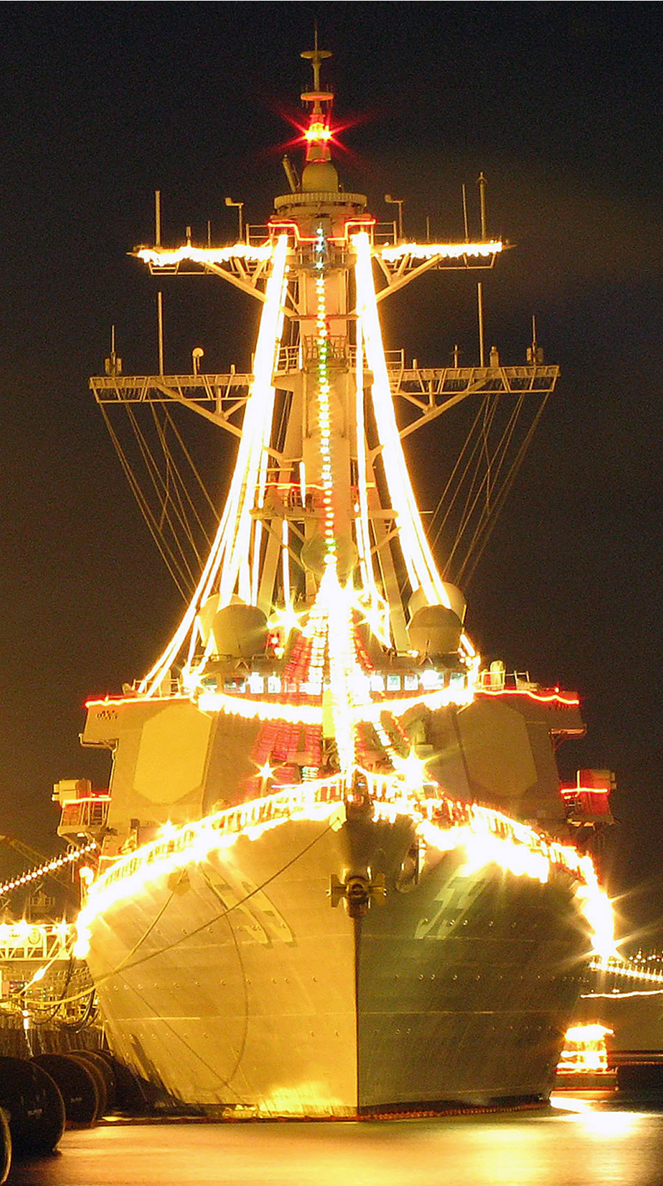 PEARL HARBOR, Hawaii (Dec. 22, 2007) Guided missile destroyer USS Russell (DDG 59) celebrates the Christmas season with a brilliant illumination of Christmas lights for which the ship placed first in the annual holiday light decorating contest, held by the Pearl Harbor Naval Base. U.S. Navy photo by Ensign Theresa Donnelly