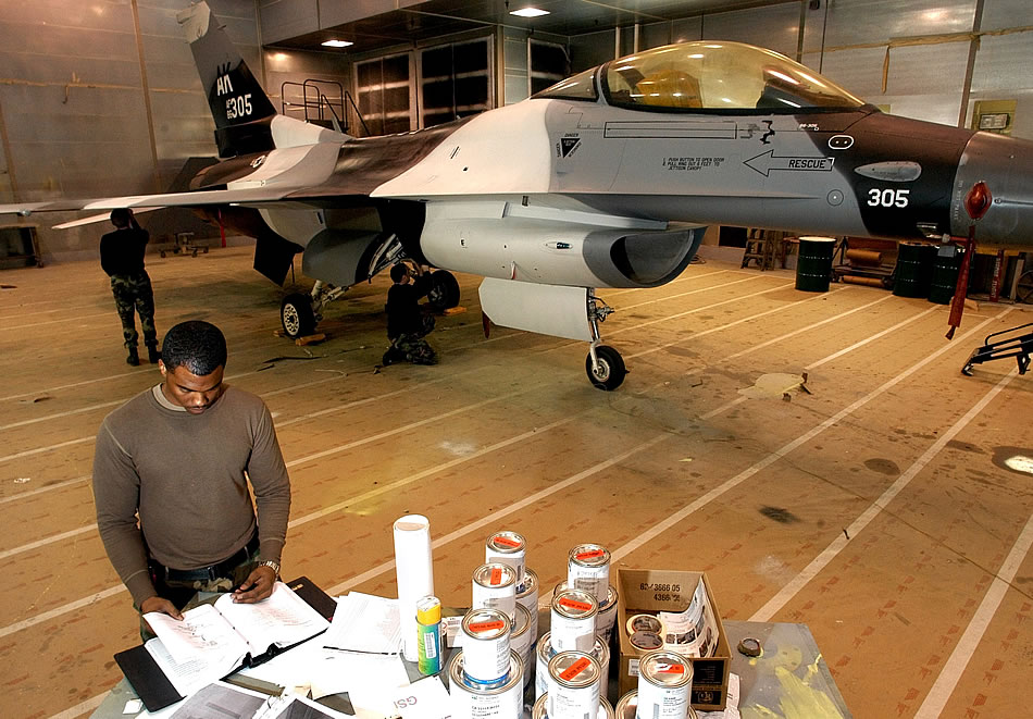 Staff Sgt. Cory Goines thumbs through a technical order manual for finishing instructions while Senior Airmen Kevin Stevens and Matt Wuensch take care of the final details on a newly painted arctic scheme F-16 Fighting Falcon Nov 30 at Kunsan Air Base, South Korea. All are aircraft structural maintenance journeymen with the 8th Maintenance Squadron, which painted the aircraft in preparation for an upcoming Eielson/Kunsan F-16 swap. The aircraft is the first unit to have the arctic scheme. (U.S. Air Force photo/ Tech. Sgt. Quinton T. Burris)