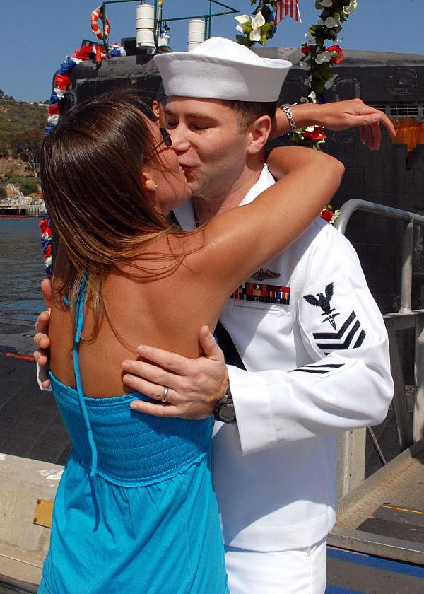 Hospital Corpsman 1st Class Keith Davis kisses his wife Angie Davis during a homecoming for the Los Angels class fast-attack submarine USS Topeka (SSN 754) returning after a six-month deployment in the western Pacific.