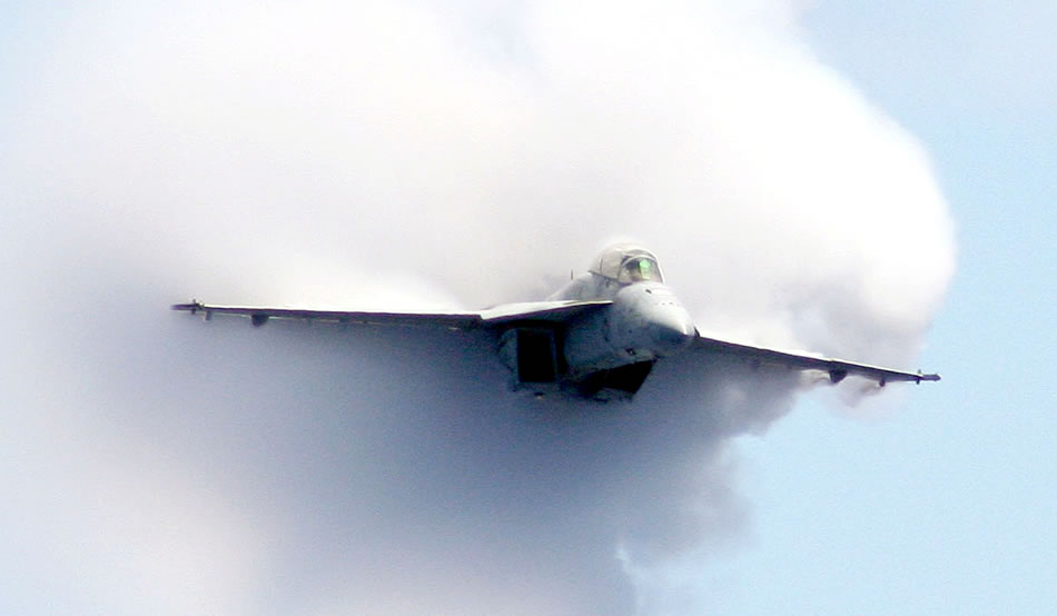 U.S. Navy Capt. Norbert Smurf Szarleta breaks the sound barrier in an F/A-18F Super Hornet strike fighter during an air power demonstration aboard the aircraft carrier USS George Washington in the Atlantic Ocean, April 17, 2008. U.S. Navy photo by Chief Yeoman Augustine Cooper