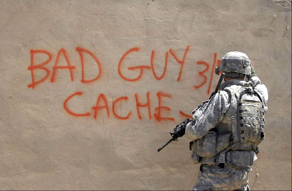 A U.S. Army soldier spray paints the wall to identify a weapons find with "Bad Guy Cache 3-5-2" found by Iraqi soldiers and police near Yarimjah, Mosul, Iraq, April 17, 2008. The U.S. soldier is assiged to the 10th Mountain Division's 5th Battalion, 25th Field Artillary, 4th Brigade. U.S. Army photo by Pfc. Sarah De Boise