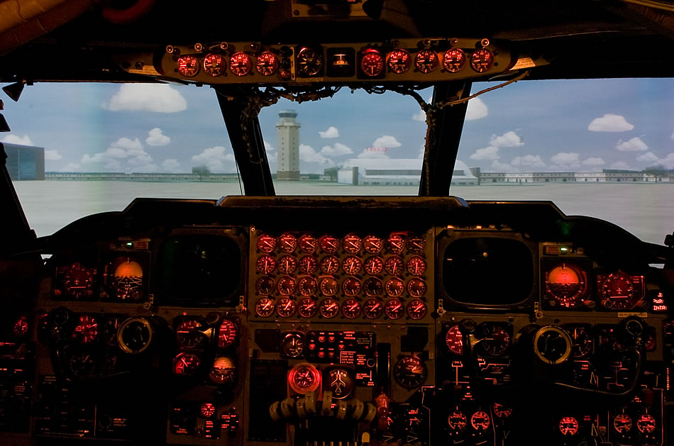 A virtual Barksdale Air Force Base, La., flightline can be seen through the windshield of a B-52 Stratofortress simulator April 28 at Barksdale AFB. A new dome projection surface provides a more realistic view for pilots training on the simulator. (U.S. Air Force photo by Lance Cheung)