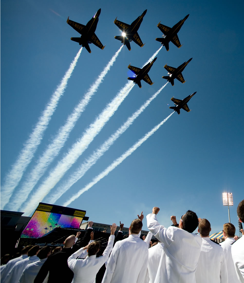 Graduates at the U.S. Naval Academy cheer as the Navy's Blue Angels fly over Navy-Marine Corps Memorial Stadium in Annapolis, Md., during their commencement ceremony, May 23, 2008. U.S.