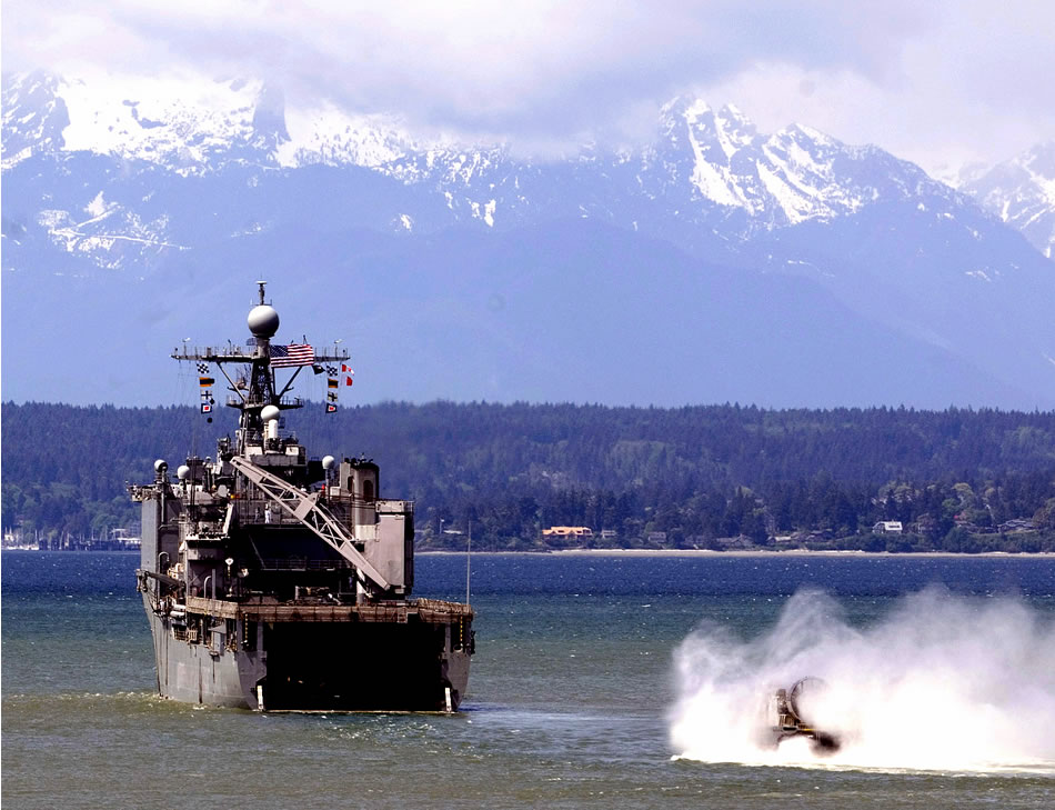 A landing craft air cushion hovers over the surface of Elliot Bay behind the amphibious dock landing ship USS Rushmore during a parade of ships to commemorate the 100th anniversary of Theodore Roosevelt's Great White Fleet, Seattle, WA., May 20, 2008. U.S. Navy photo by Petty Officer 2nd Class Jason Beckjord
