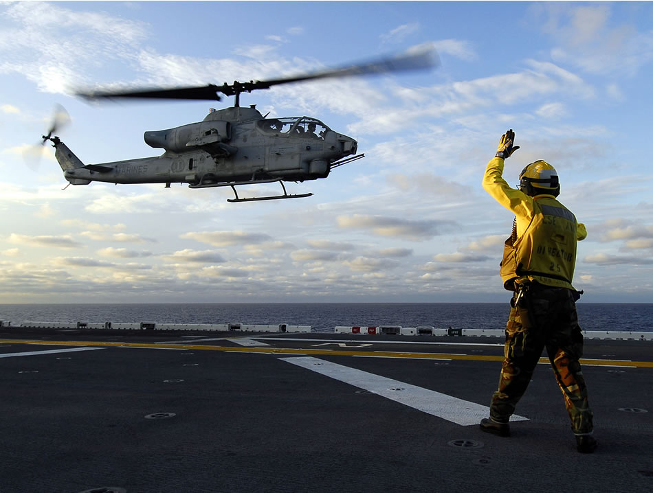 ATLANTIC OCEAN (Aug. 30, 2008) Aviation Boatswain's Mate Handling 3rd Class Lataf Bush launches an AH-1W Cobra from Marine Medium Helicopter Squadron (HMM) 264 off the flight deck of the multi-purpose amphibious assault ship USS Iwo Jima (LHD 7). Iwo Jima, the flagship of the Iwo Jima Expeditionary Strike Group, is on a scheduled deployment en route to the U.S. 5th and 6th Fleet areas of responsibility supporting maritime security operations. U.S. Navy photo by Mass Communication Specialist Seaman Chad R. Erdmann