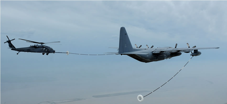An HH-60 Pave Hawk receives fuel from a HC-130 Hercules during search and rescue operations in Galveston, Texas, after Hurricane Ike, Sept. 13. Both aircraft are assigned to the 331st Air Expeditionary Group at Randolph Air Force Base, Texas. (U.S. Air Force photo/Staff Sgt. James L. Harper Jr.)