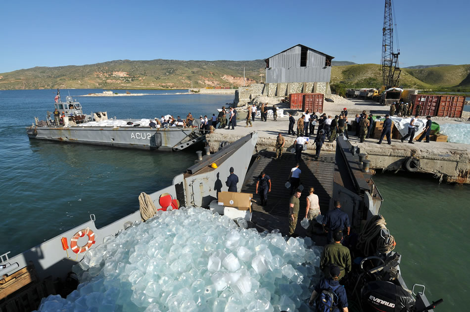 GONAIVES, Haiti (Sept. 15, 2008) Service members embarked aboard the amphibious assault ship USS Kearsarge (LHD 3) unload food and water during disaster relief support to areas affected by recent hurricanes in Haiti. Kearsarge has been diverted from the scheduled Continuing Promise 2008 humanitarian assistance deployment in the western Caribbean to conduct hurricane relief operations in Haiti. U.S. Navy photo by Mass Communication Specialist 3rd Class David Danals