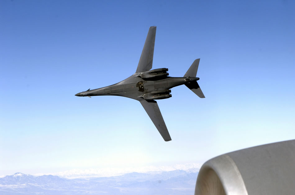 A B-1B Lancer from the 9th Expeditionary Bomb Squadron pulls away from a KC-135 Stratotanker from the 22nd Expeditionary Air Refueling Squadron at Manas Air Base, Kyrgyzstan, and deployed from the 92nd Air Refueling Wing, Fairchild Air Force Base, Wash., over Afghanistan. The 22nd EARS refuels aircraft in and around Afghanistan. (U.S. Air Force photo/Staff Sgt. Angelique Perez)