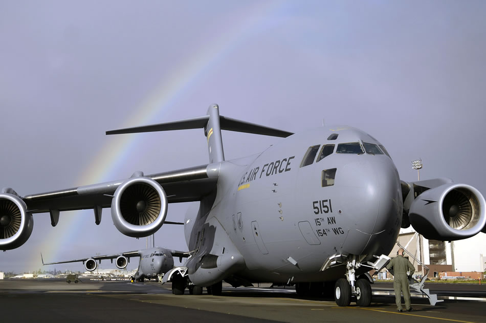 Staff Sgt. John Eller conducts pre-flights check on his C-17 Globemaster III Jan. 3 prior to taking off from Hickam Air Force Base, Hawaii, for a local area training mission. Sgt. Eller is a loadmaster from the 535th Airlift Squadron. (U.S. Air Force photo/Tech. Sgt. Shane A. Cuomo)