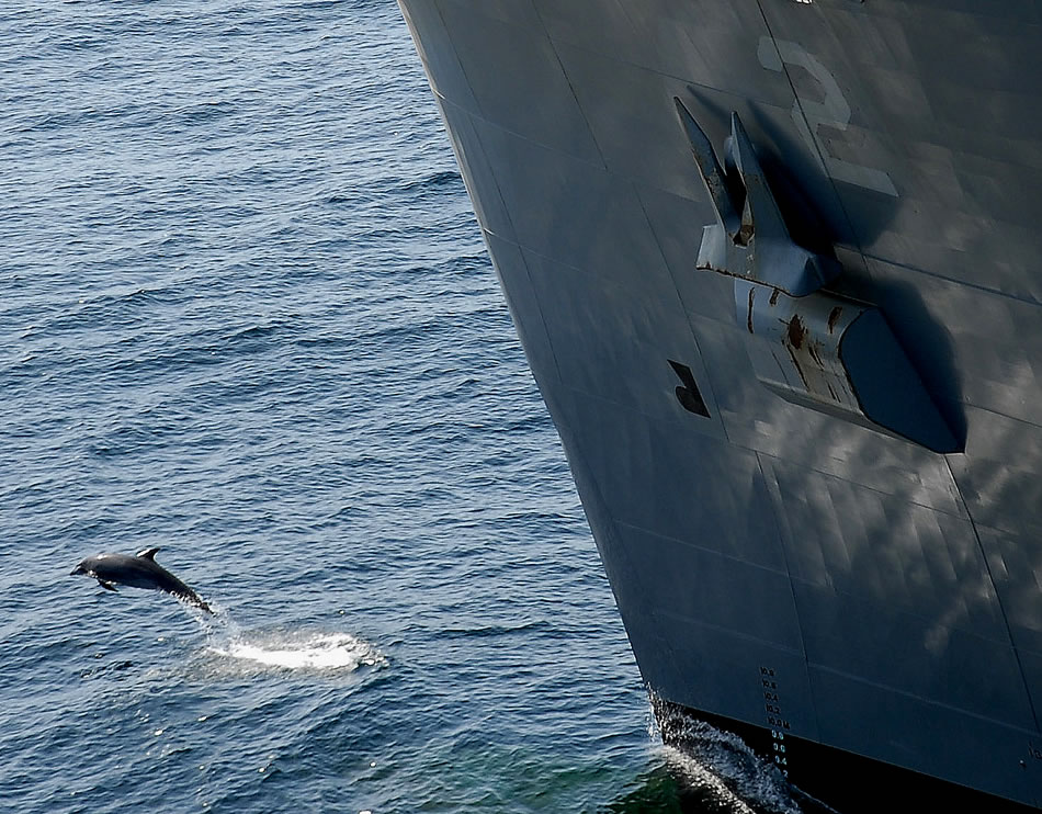 PERSIAN GULF (Feb. 10, 2008) A porpoise plays off the bow of the dry cargo/ammunition ship USNS Sacagawea (T-AKE 2). U.S. Navy photo by Lt. Erik Reynolds