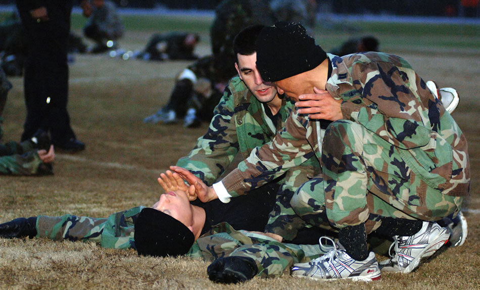 Capt. Jay K. Phomavong shows officer trainees self-defense tactics Jan. 29 during the new Air Force Combative Program course held at Officer Training School at Maxwell Air Force Base, Ala. The course is designed to instill confidence in the trainees' ability to defend themselves; attack and subdue an enemy; develop mental toughness; instill warrior ethos; and provide them with a basic set of unarmed combat skills. Captain Phomavong is the 24th Training Squadron flight commander.(U.S. Air Force photo/Master Sgt. Scott Moorman)