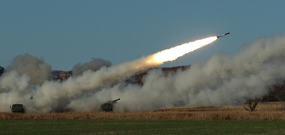 Members of the Singapore armed forces launch a volley of rockets from their newly-acquired High-Mobility Artillery Rocket System during a certification exercise, here at Fort Sill. The event culminated in a combined live fire with the soldiers of B Battery, 1st Battalion, 14th Field Artillery Regiment, Nov. 19.