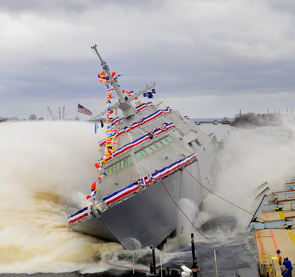 MARINETTE, Wis. (Dec. 4, 2010) The littoral combat ship Pre-Commissioning Unit (PCU) Fort Worth (LCS 3) is launched into the Menominee River during a christening ceremony for the navy's third littoral combat ship. Fort Worth will continue to undergo outfitting and testing at Marinette Marine before delivery to the Navy in 2012. (U.S. Navy photo courtesy of Lockheed Martin)