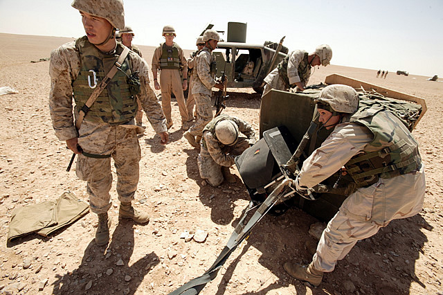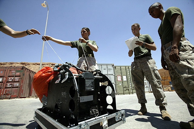 Marines remove Sherpa unit from a load of supplies that was just dropped, and guided to a pinpoint parachute landing in Iraq, by the Sherpa unit.