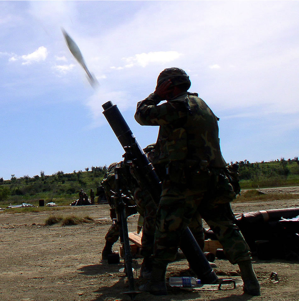11/18/04 - Sgt. Zody Mohammed (front), Spc. Greg Williams, and Staff Sgt. Joaquin Rodriguez, all with Joint Task Force, 2nd Battalion, 113 Infantry Regiment, New Jersey National Guard, fire a mortar during live fire training at Hicacal Range in Guantanamo Bay, Cuba, Nov. 18, 2004.